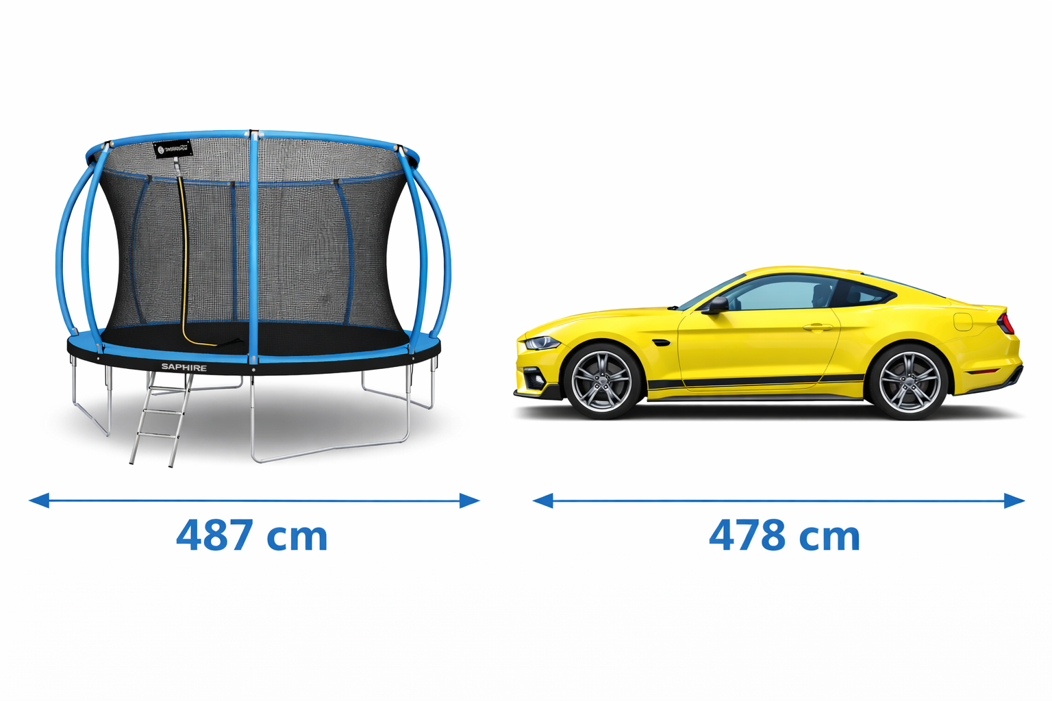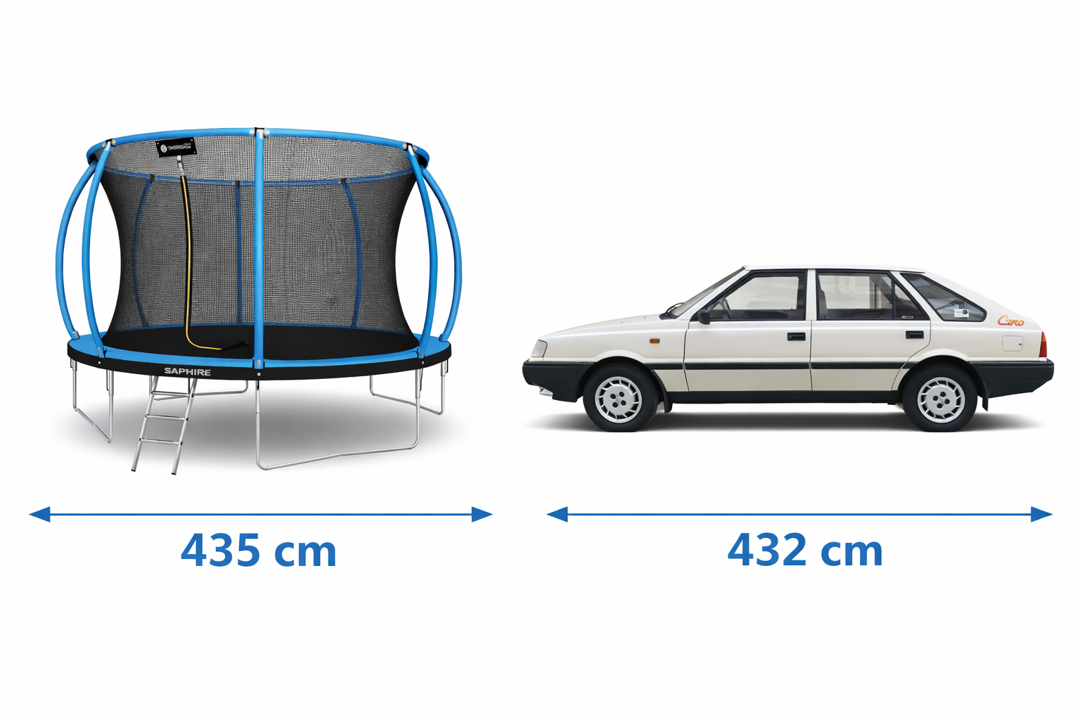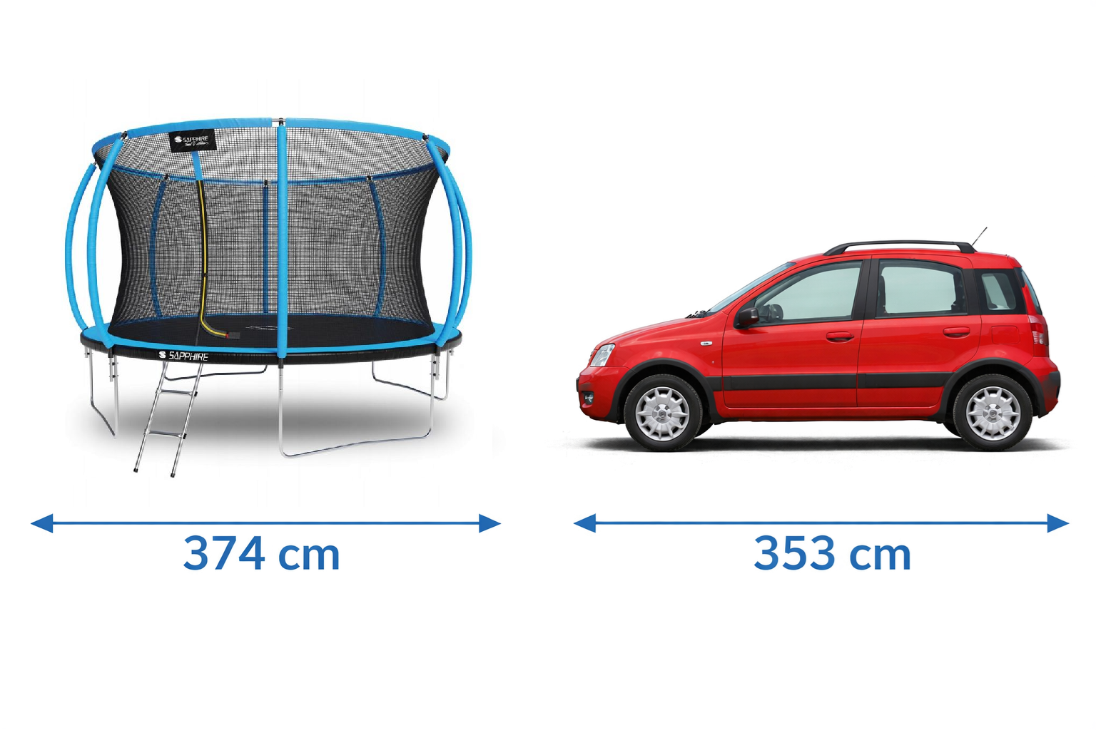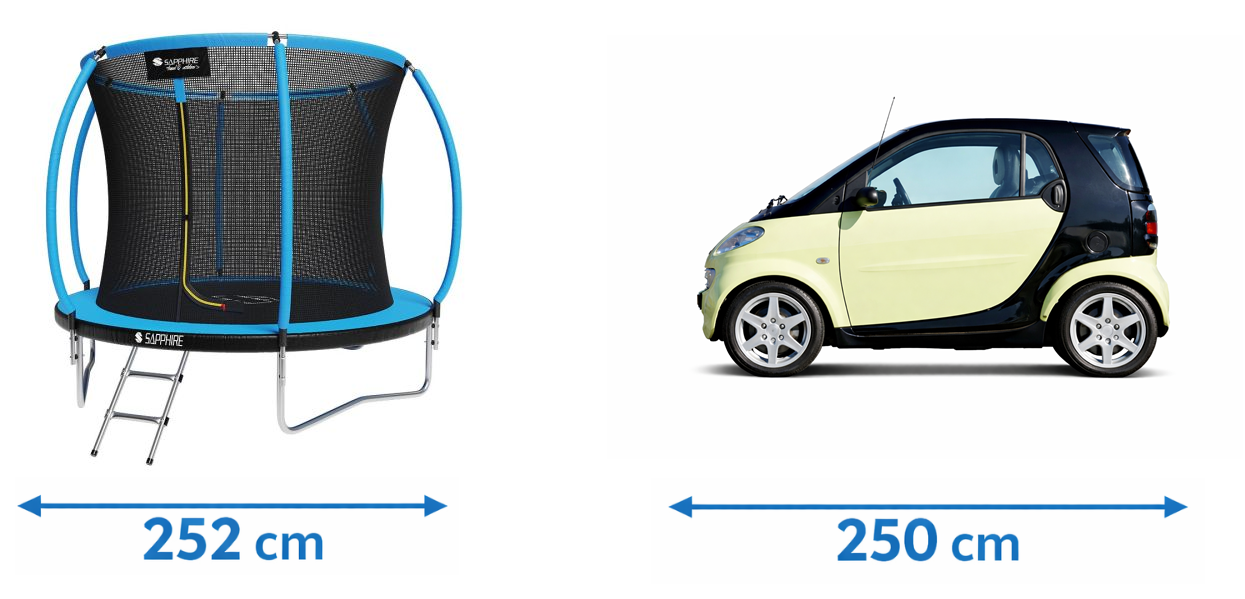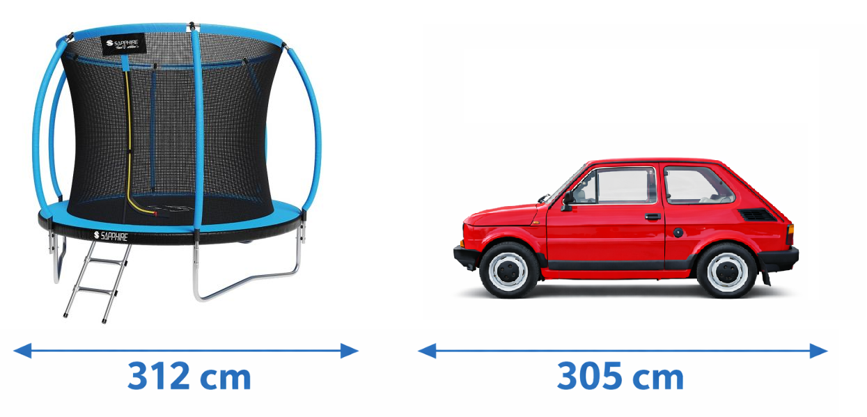 Wymiary podawane w stopach lub centymetrach często niewiele mówią osobom, które dopiero planują zakup trampoliny. Natomiast samochody to coś, co widzimy codziennie. Każdy potrafi wyobrazić sobie, ile miejsca zajmuje Smart, Fiat 126p czy Ford Mustang. Dzięki temu prostemu porównaniu znacznie łatwiej ocenić, czy dana trampolina zmieści się w ogrodzie i czy jej rozmiar będzie odpowiedni dla Twojej przestrzeni. Jeżeli więc zastanawiasz się nad wyborem trampoliny, spróbuj pomyśleć o niej nie w kategoriach „10 FT” czy „12 FT”, ale raczej jako o samochodzie stojącym na trawniku. Nagle wszystko staje się dużo bardziej czytelne.