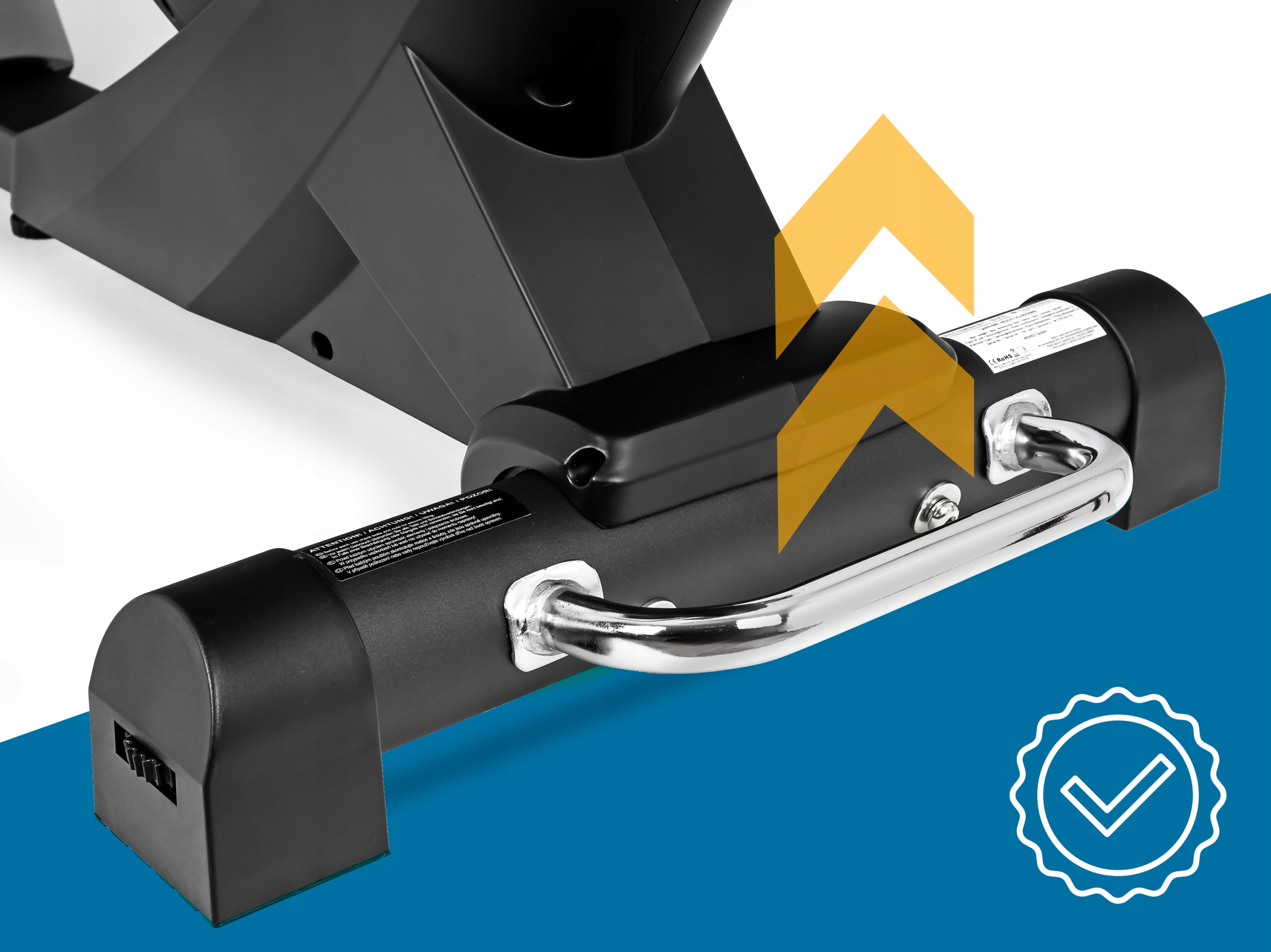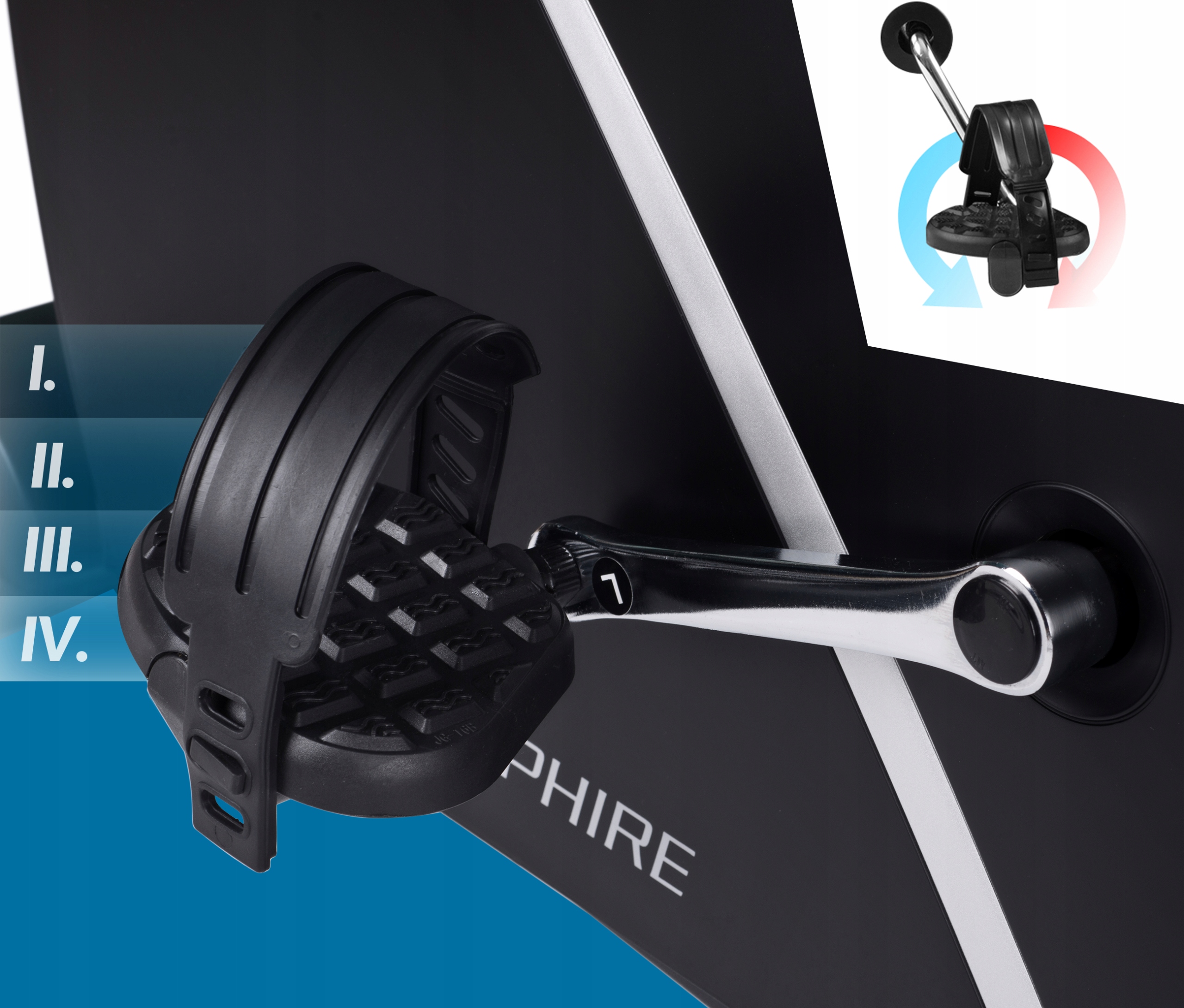 - Stabilne podparcie dla stóp ma zasadniczy wpływ nie tylko na komfort ćwiczenia, ale przede wszystkim na jego efektywność. W naszym rowerze zastosowano pedały z równomiernym, antypoślizgowym rozłożeniem punktów nacisku stopy, tak aby ćwiczenie stało się jeszcze bardziej przyjemne.