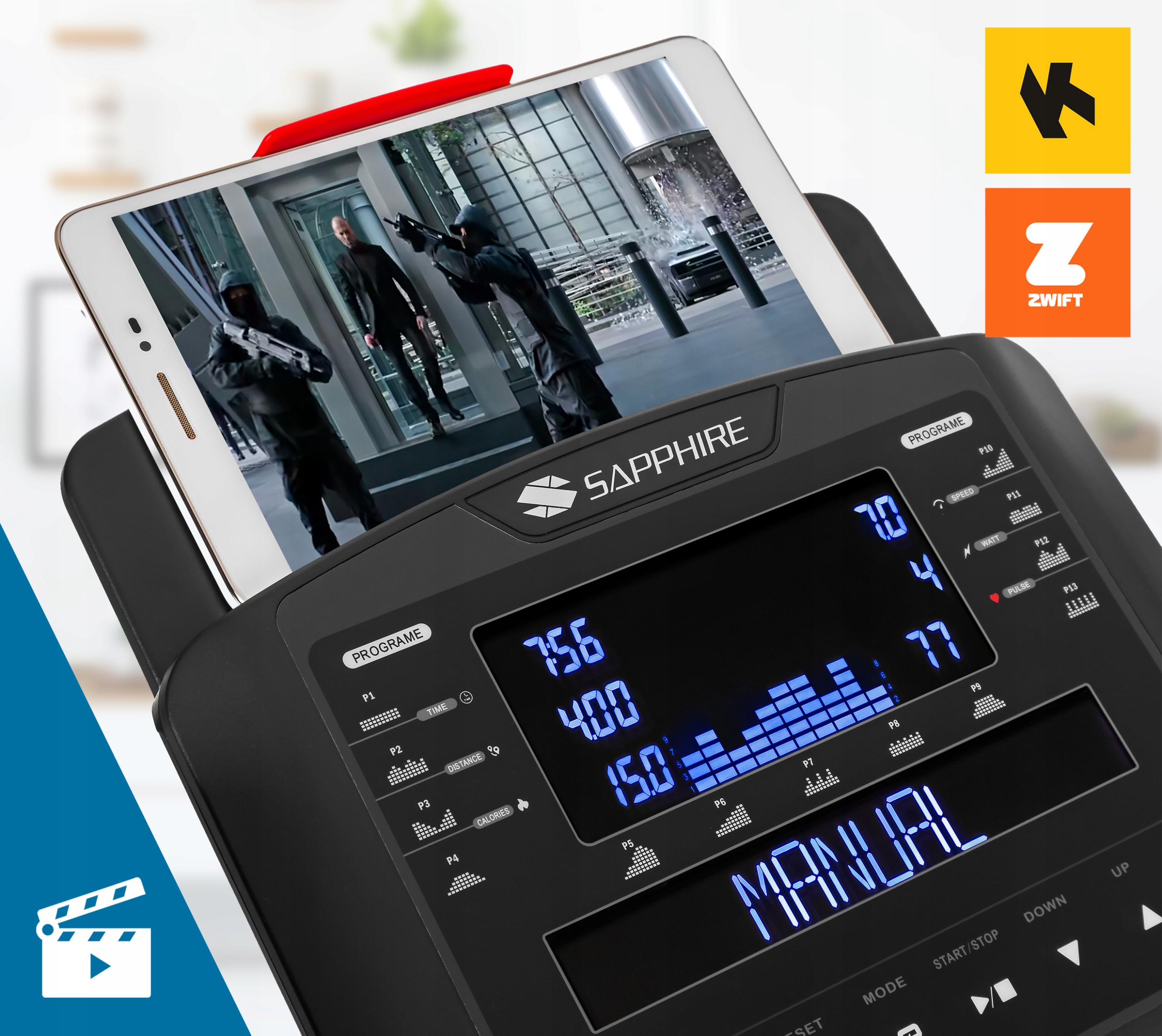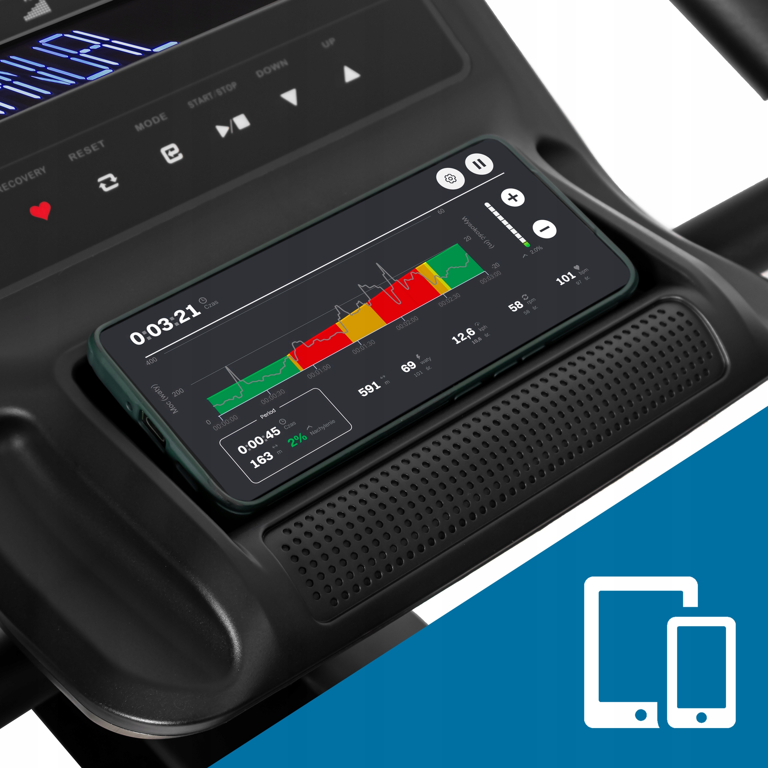 Istotnym dodatkiem jest podstawka na tablet i smartfon - teraz w trakcie treningu możesz oglądać film lub ulubiony serial (tablet i smartfon służą celom demonstracyjnym i nie wchodzą w skład zestawu).