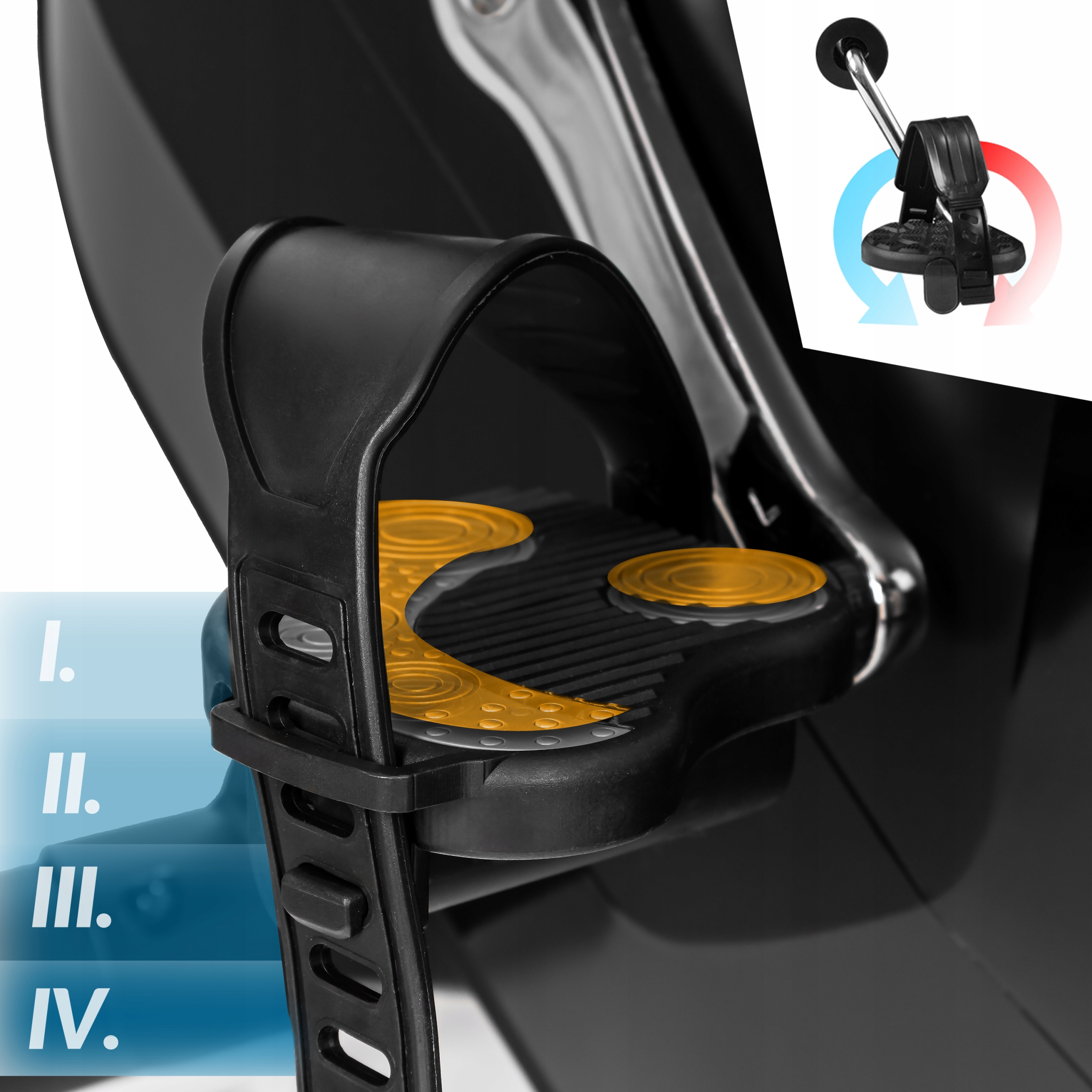 - Stabilne podparcie dla stóp ma zasadniczy wpływ nie tylko na komfort ćwiczenia, ale przede wszystkim na jego efektywność. W naszym rowerze zastosowano pedały z równomiernym, antypoślizgowym rozłożeniem punktów nacisku stopy, tak aby ćwiczenie stało się jeszcze bardziej przyjemne.