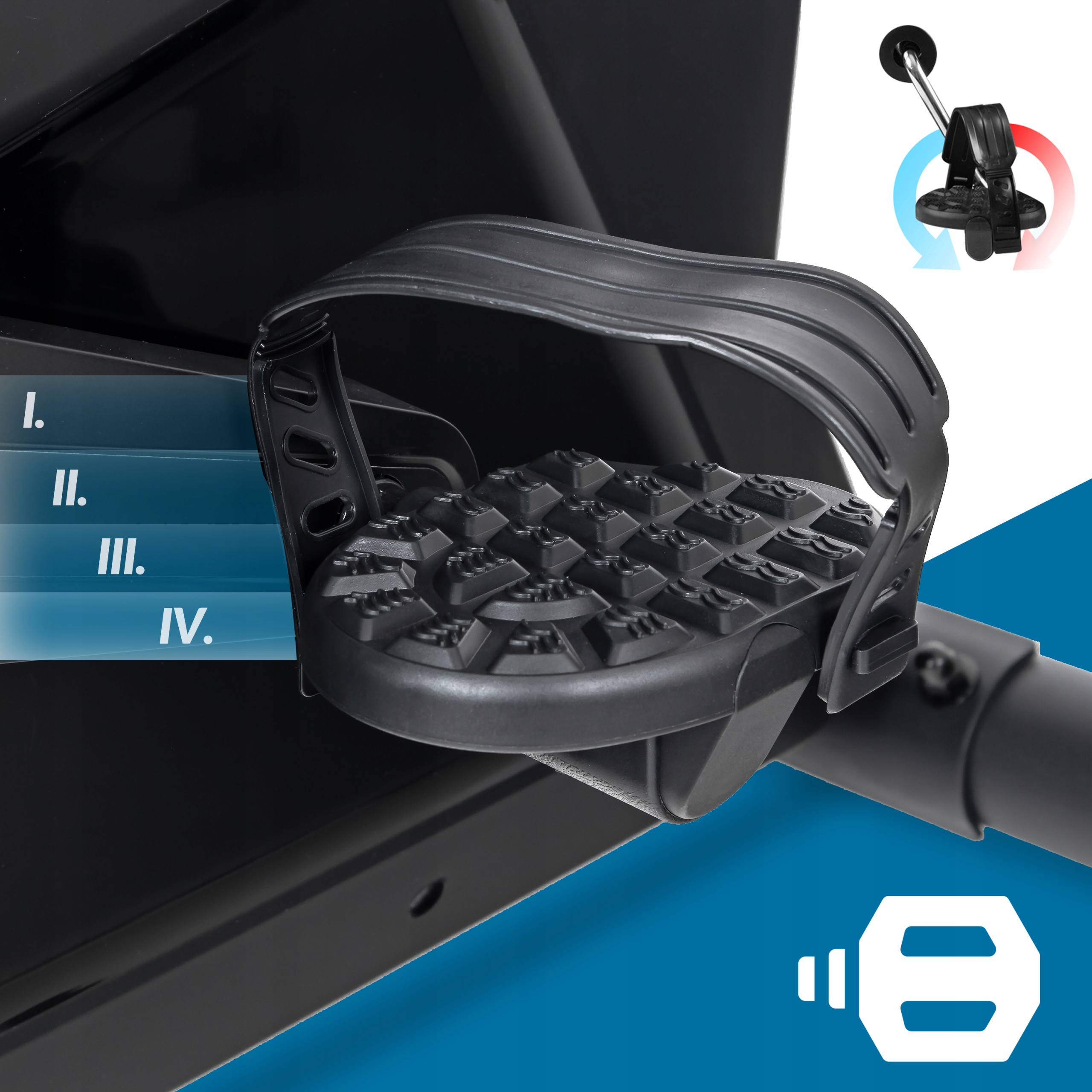 - Stabilne podparcie dla stóp ma zasadniczy wpływ nie tylko na komfort ćwiczenia, ale przede wszystkim na jego efektywność. W naszym rowerze zastosowano pedały z równomiernym, antypoślizgowym rozłożeniem punktów nacisku stopy, tak aby ćwiczenie stało się jeszcze bardziej przyjemne.