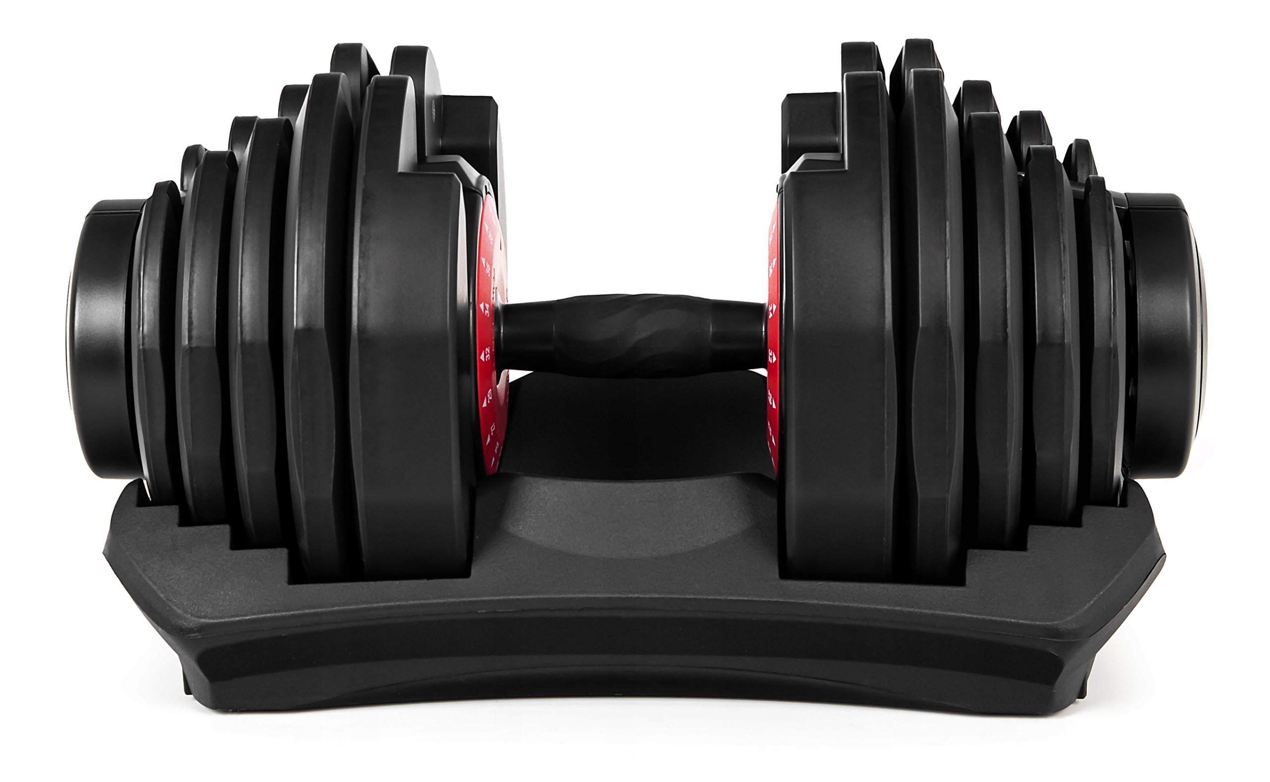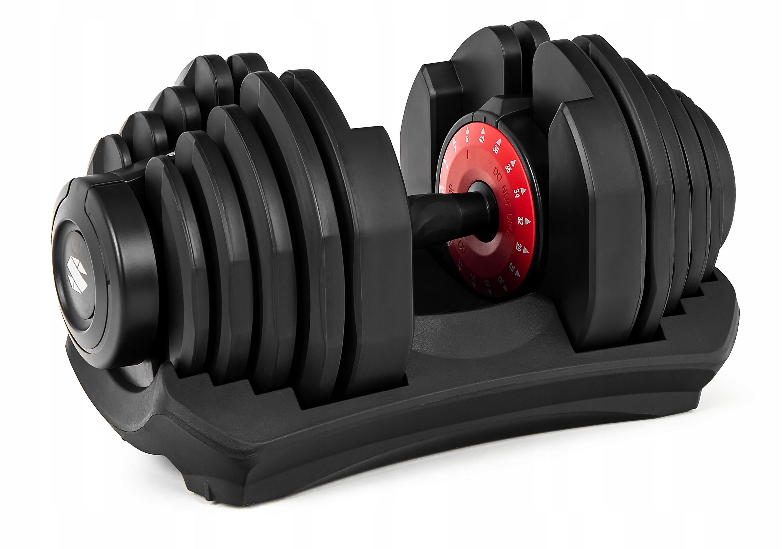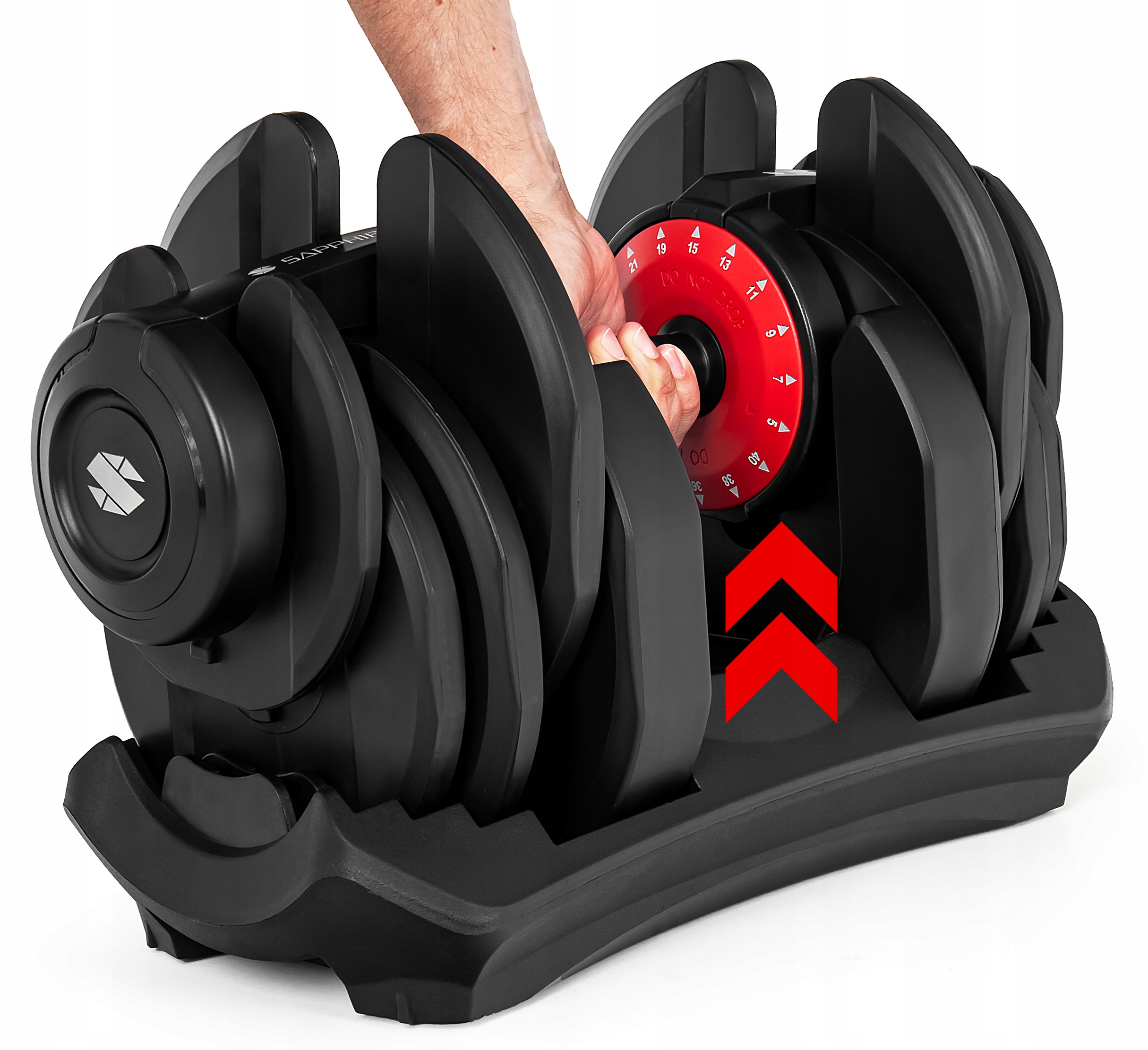 - Wystarczy odłożyć hantel do podstawy i przekręcić uchwyt, aby wybrać odpowiedni ciężar. Teraz możesz podnieść hantel, na którym znajdą się tylko wybrane talerze.