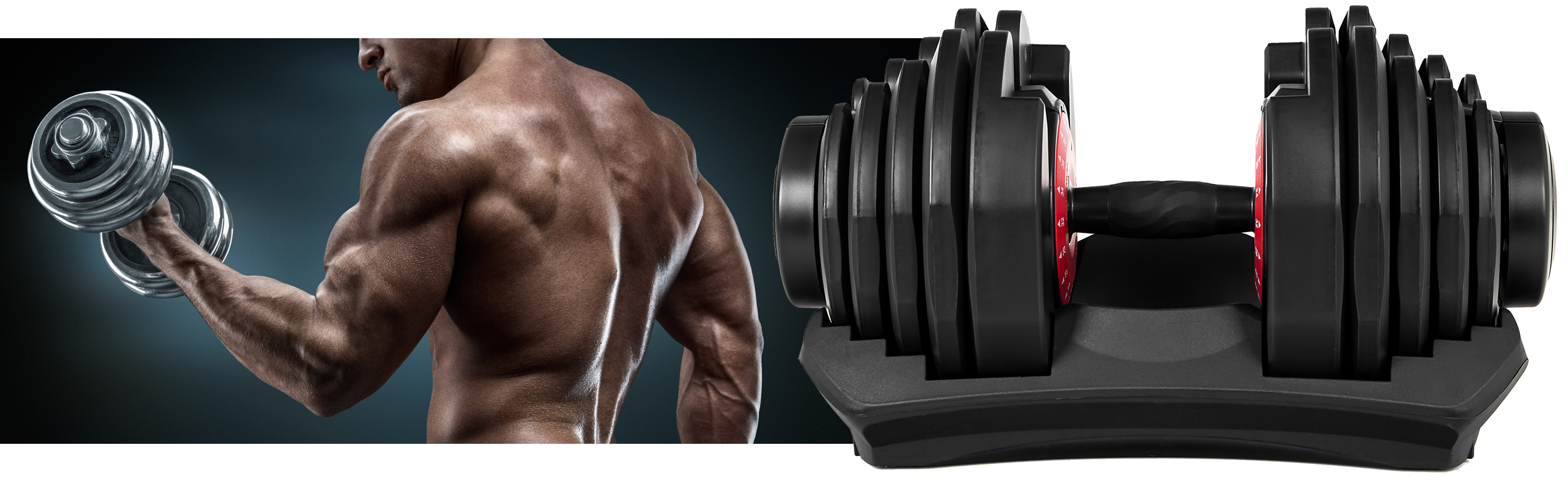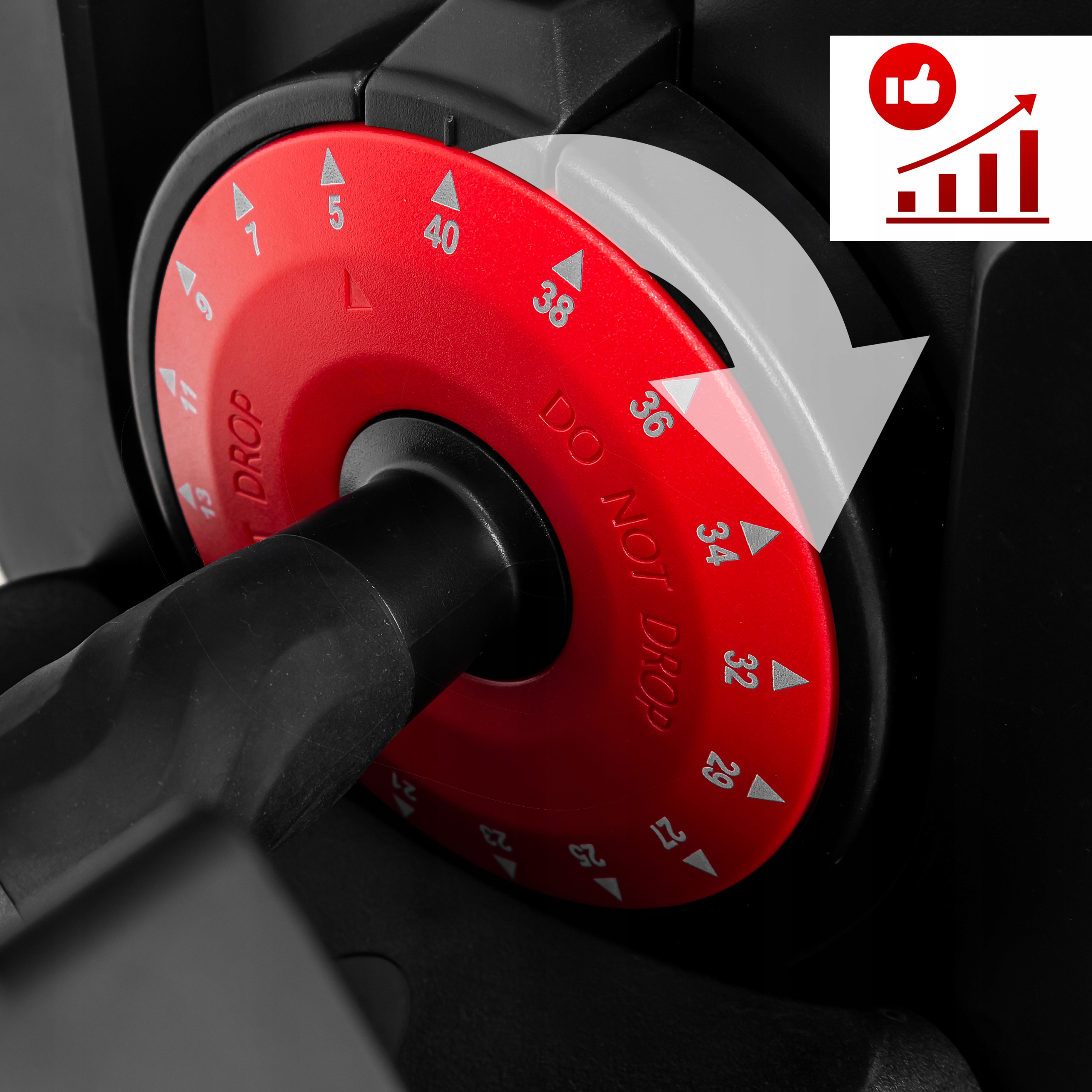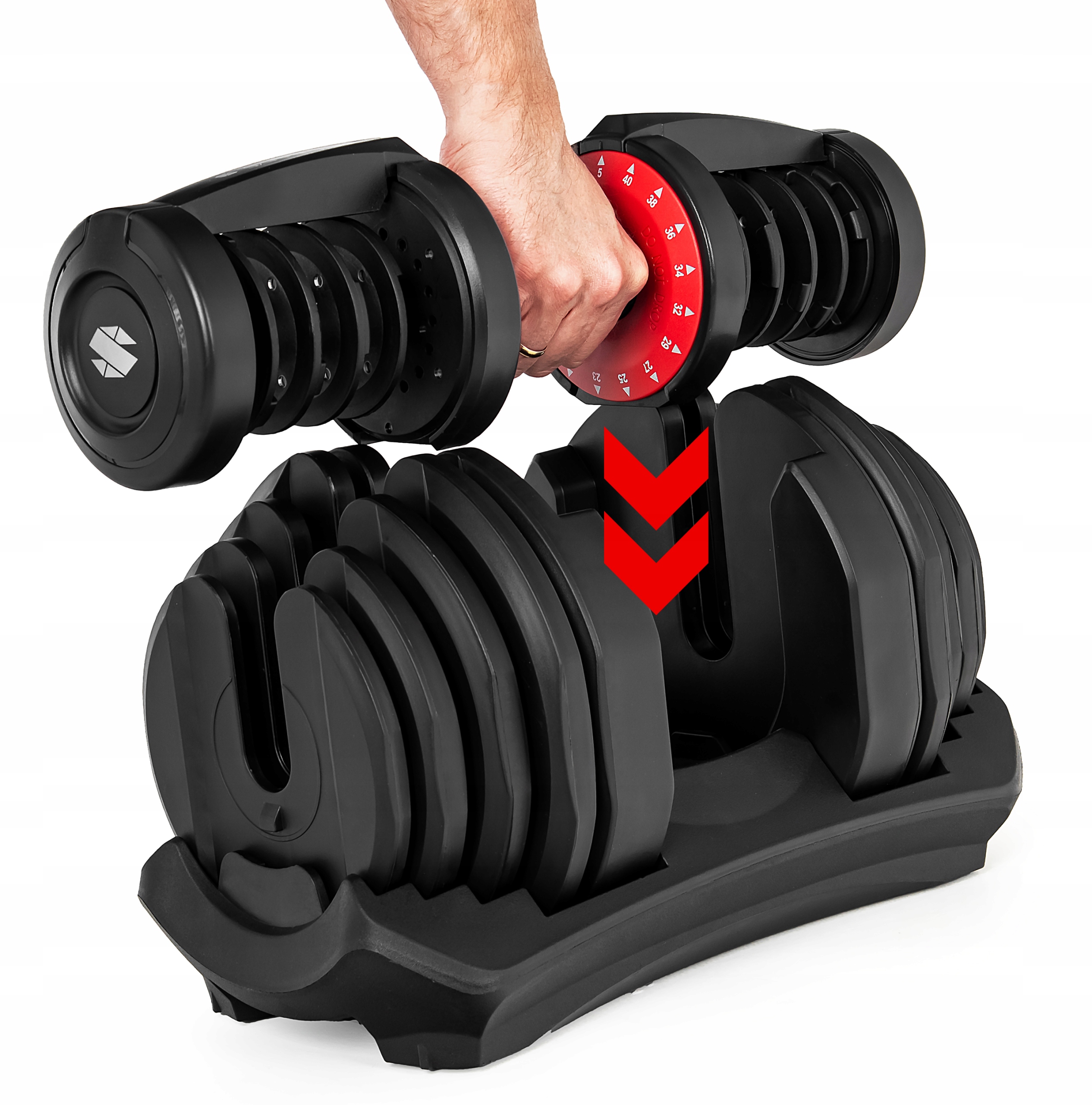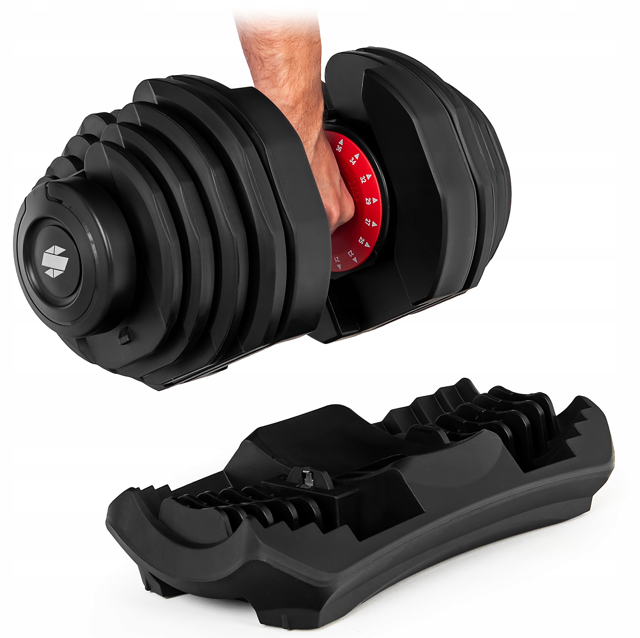 - Wystarczy odłożyć hantel do podstawy i przekręcić uchwyt, aby wybrać odpowiedni ciężar. Teraz możesz podnieść hantel, na którym znajdą się tylko wybrane talerze.
