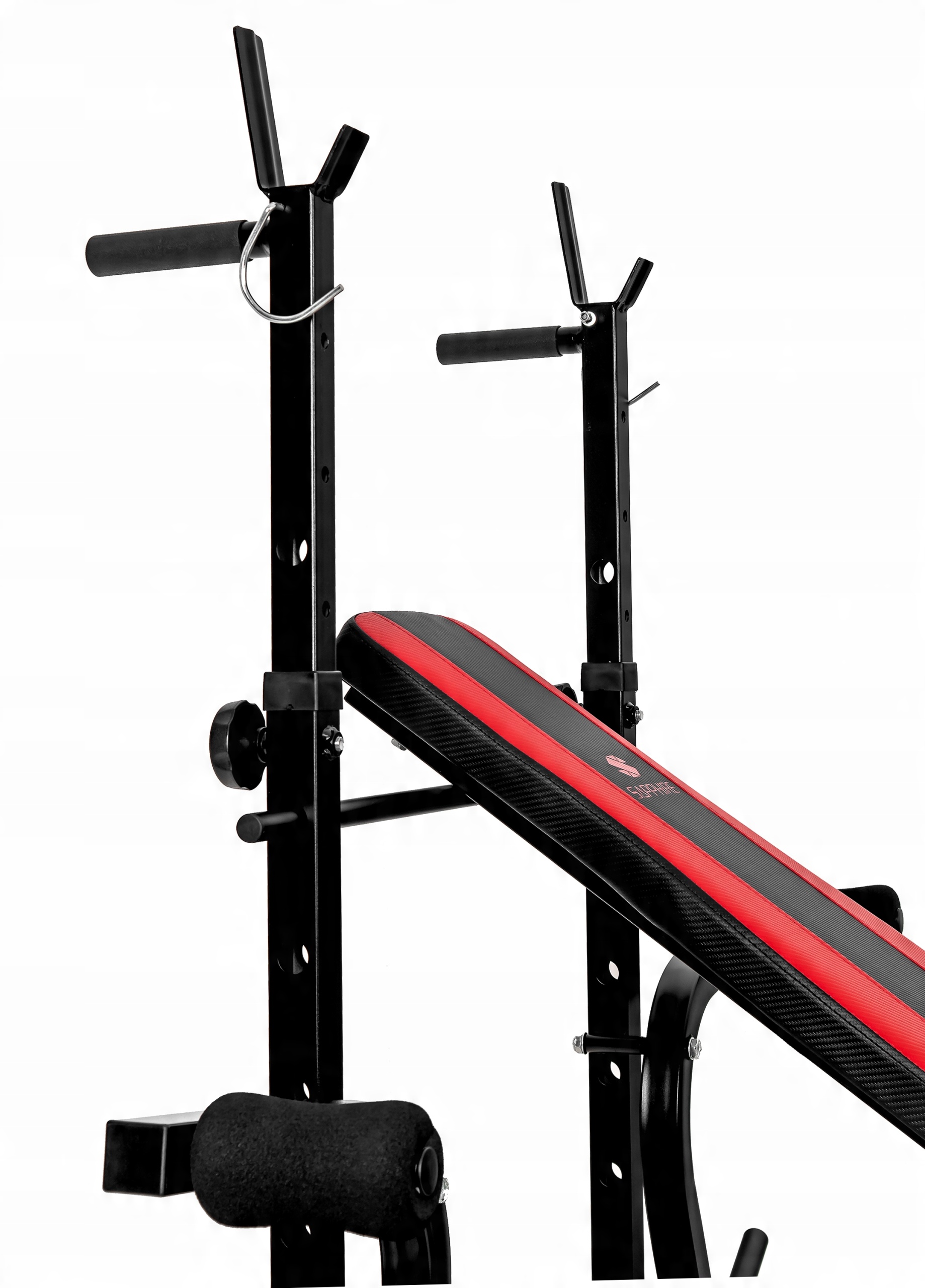 - Na stojakach mieszczone zostały praktyczne blokady do sztangi. O bezpieczeństwo ćwiczącego dbają stabilne podstawy z dociskami w formie pokręteł - pozwalają szybko zmienić wysokość stojaków.