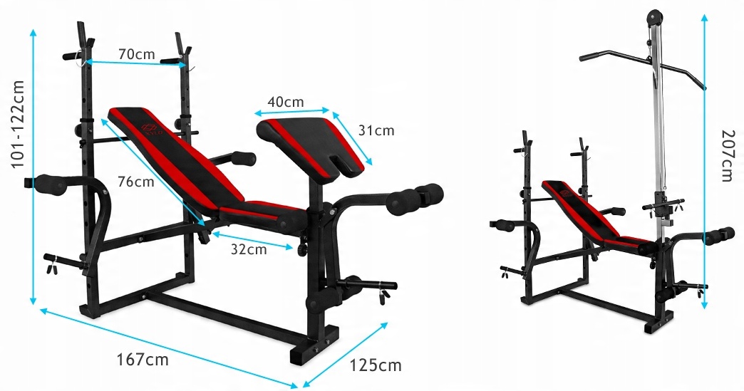 | Dodatkowe informacje: | oparcie: 76 x 30 x 4,5 cm; siedzisko: 32 x 30 x 4,5 cm; modlitewnik: 40 x 31 cm; rozstaw stojaków: wew. 59 cm, zew. 70 cm; długość zasobnika na ciężary prasa/rozpiętki: 19 cm, śr. 25 mm; wyciąg: drążek 94,5 cm. części na ciężary: 2x22,5 cm |